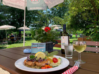 Im schönen Biergarten an der Alzfähre gibt es besondere Gerichte mit besten Zutaten direkt aus der Region.