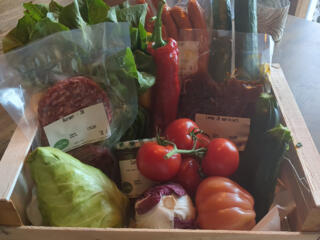 - Grillkiste mit Grillgemüse, Salat, Fleisch& Würsten vom Weideochsen, Grillkäse...
